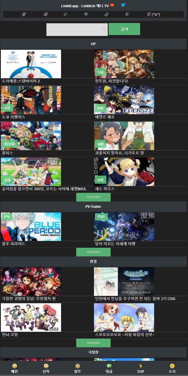 요일별 신작, 장르별, 종영 애니, 극장판 등을 쉽게 찾아볼 수 있으며, 모바일 환경에 최적화되어 있어서 그런지 버퍼링도 굉장히 빠른 사이트입니다.